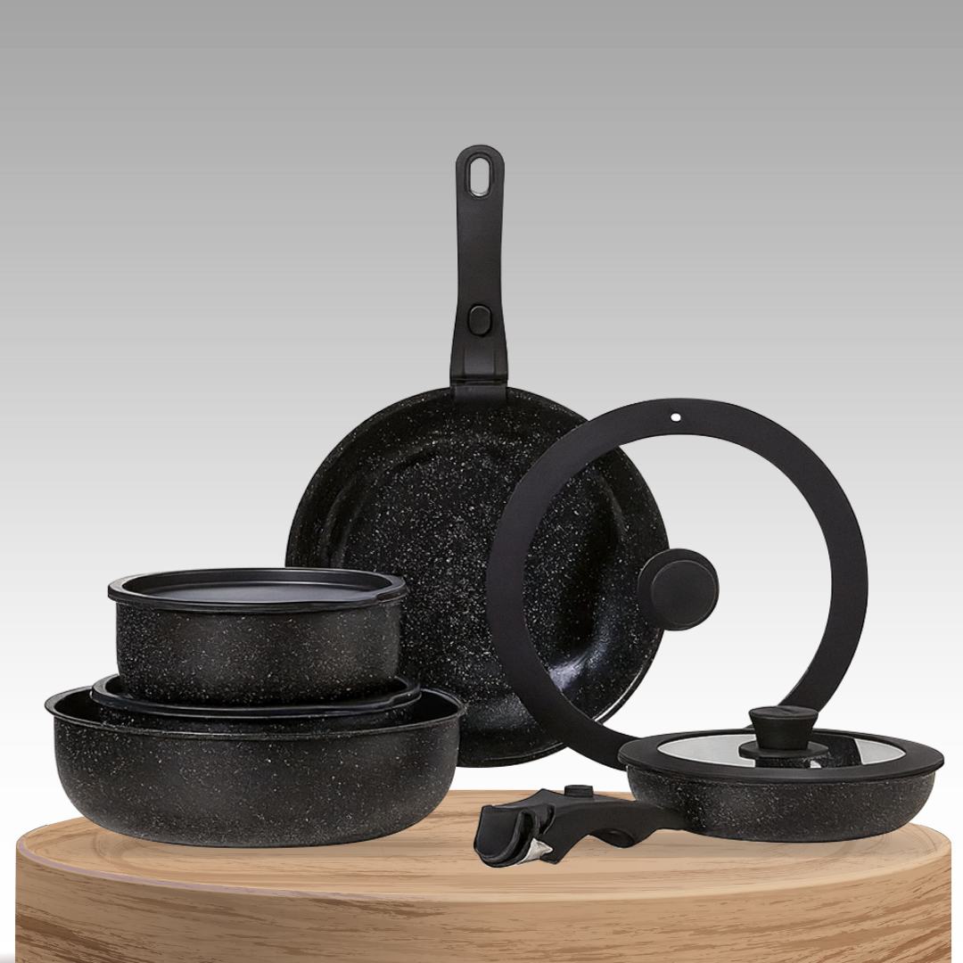 A twelve-piece ceramic-coated cookware set for everyday meals. Non-stick surfaces simplify cooking and cleanup. Detachable handles move from stovetop to oven. Stackable black pieces fit induction cooktops and small kitchens.