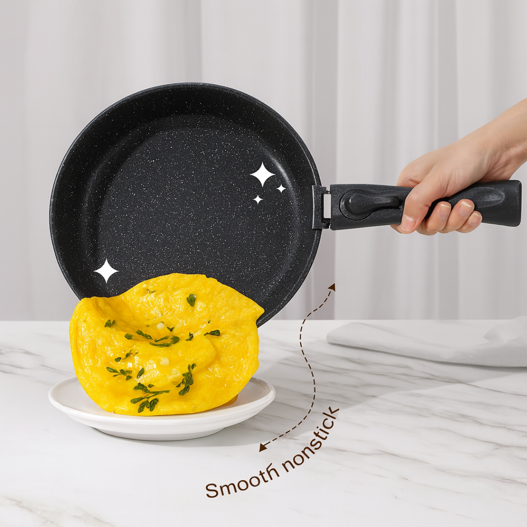 Fry, sear, and simmer with included frying pans and a saucepan. Move handles off for baking or storage. Nest pieces after cooking to save space and streamline daily kitchen workflows.
