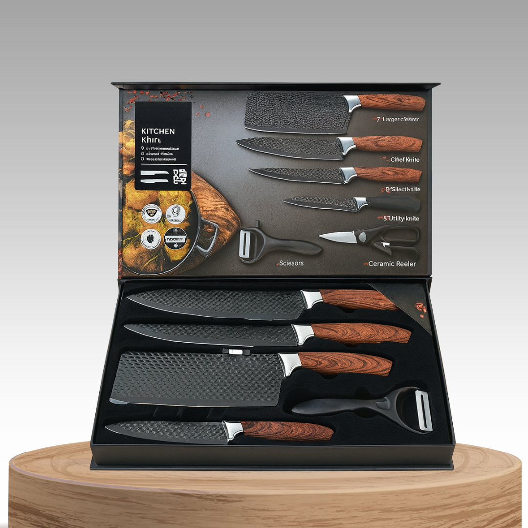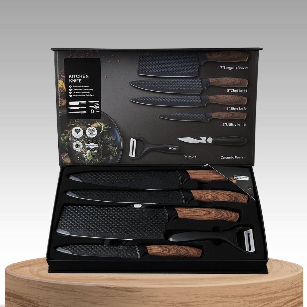 - 6-piece complete kitchen set including chef’s knife, utility knife, paring knife, scissors, and peeler