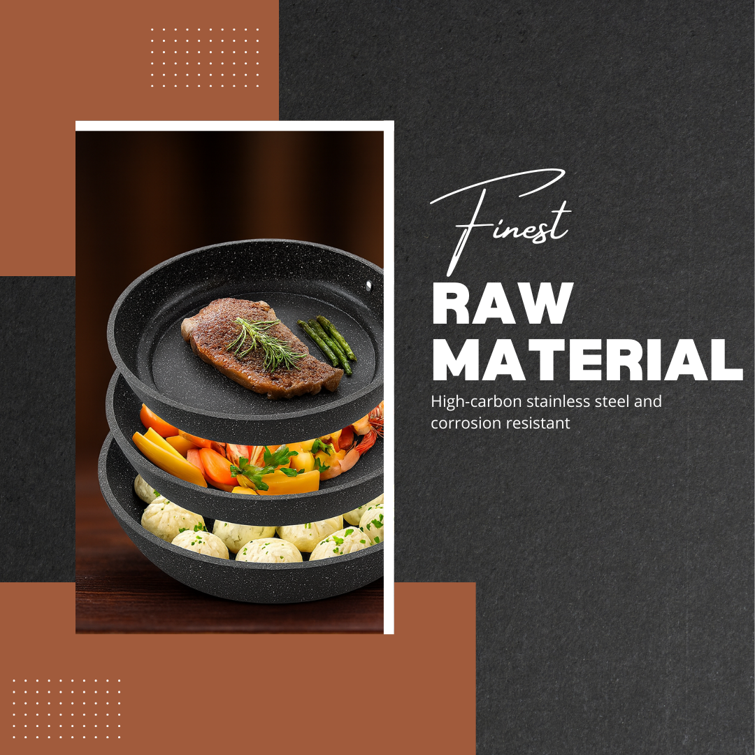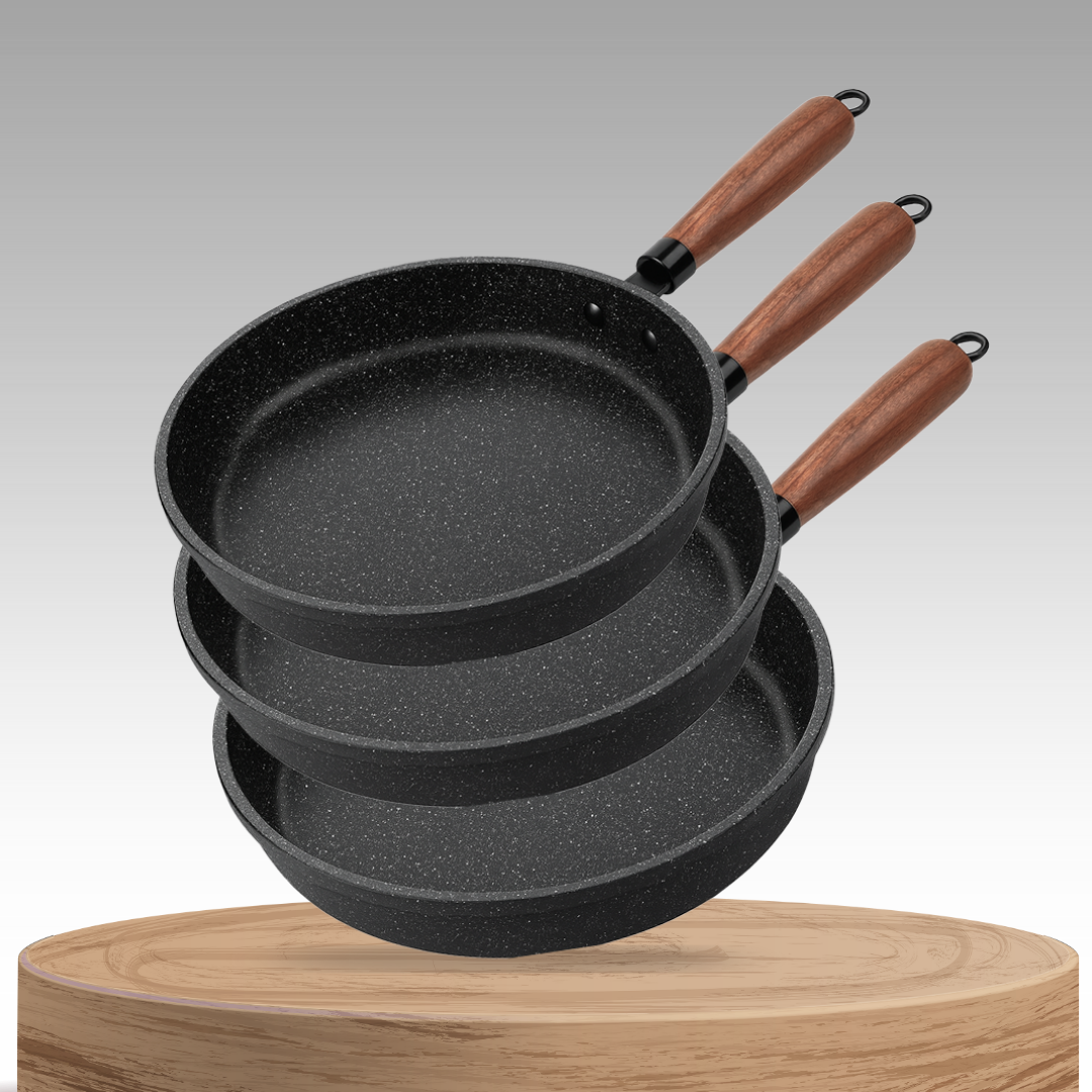 A practical three-piece frying pan set crafted for convenience. Its non-stick design reduces smoke while ensuring food releases easily, making cooking faster, cleaner, and far more enjoyable daily.