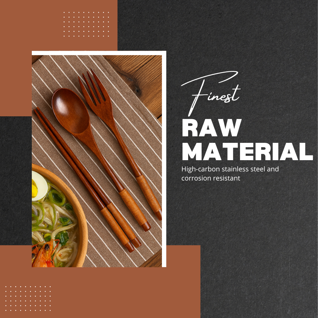 Tailored for food lovers on the go, this set combines sustainability with convenience. The unique winding grip detail on each utensil not only preserves the rustic character of the wood but also enhances handling and comfort.