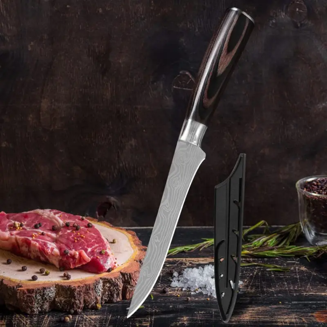 The Nokari Laser‑Edge Boning Knife is designed for exact trimming and filleting, letting you glide through meat or fish with confidence. Its laser-patterned blade and ergonomic handle merge form and function for everyday kitchen mastery.