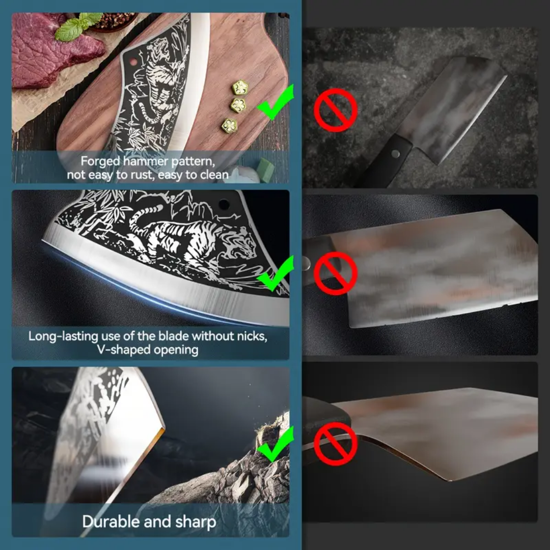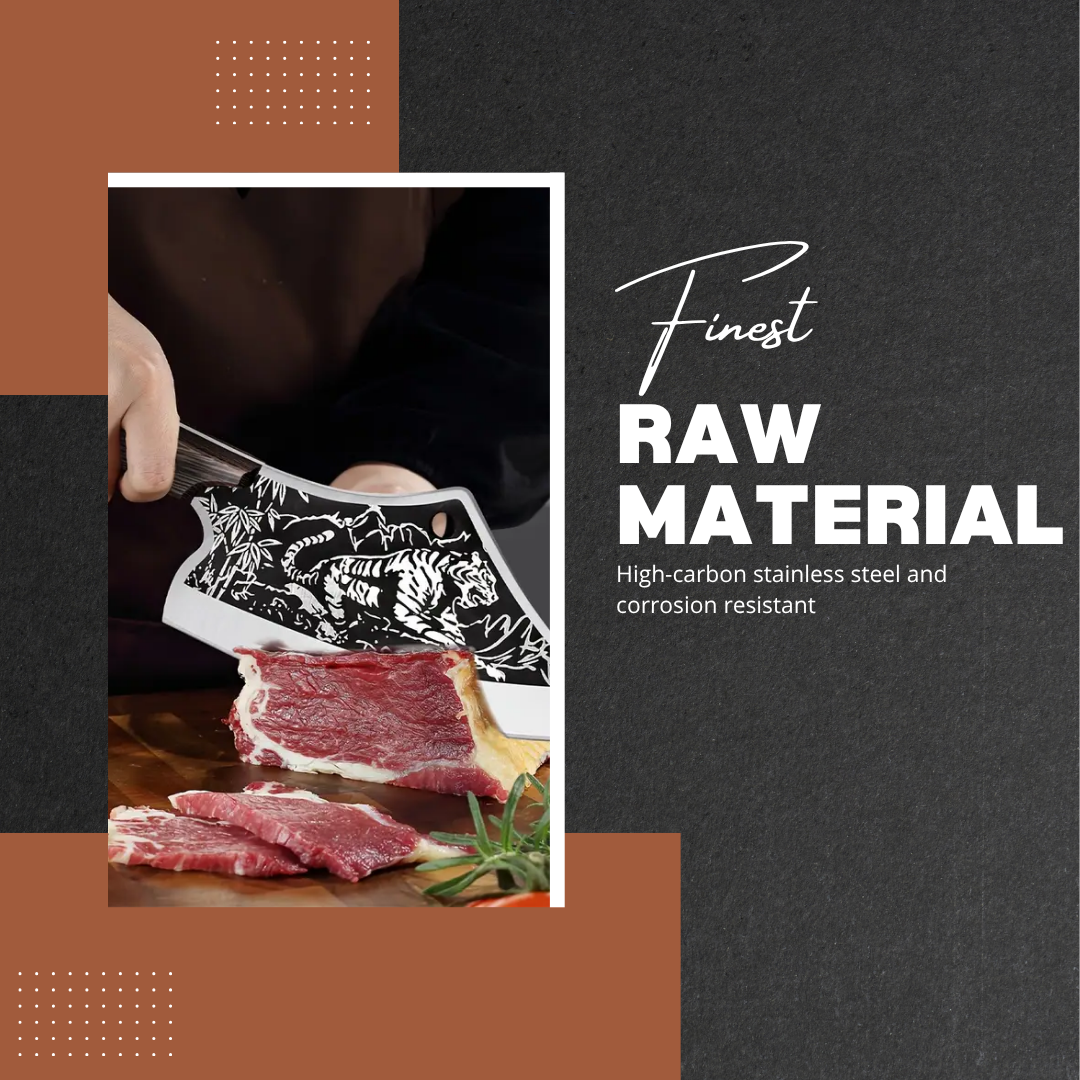 Command your kitchen with the ProBone | Hand-Carved 8″ Meat & Bone Knife, featuring a tiger-etched blade and curved edge that slice effortlessly through bone and meat with striking precision.