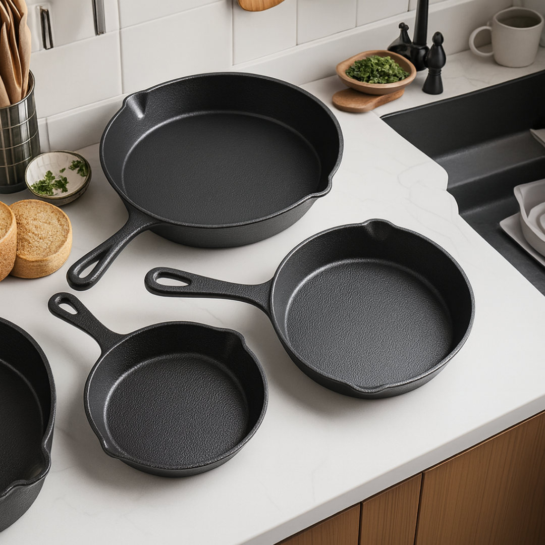 Cast Iron Construction: Durable pans with excellent heat retention for effective cooking.