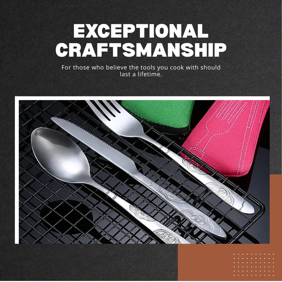 Designed with portability in mind, this set includes essential utensils for versatile dining. Lightweight yet durable, it ensures comfort in use while being easy to carry, clean, and store wherever needed.